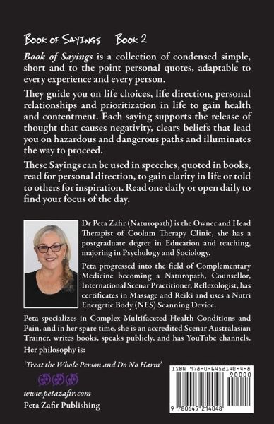 Book of Sayings Book 2 is a collection of condensed simple, short and to the point personal quotes, adaptable to every experience and every person. They guide you on life choices, life direction, personal relationships and prioritization in life to gain health and contentment. Each saying supports the release of thought that causes negativity, clears beliefs that lead you on hazardous and dangerous paths and illuminates the way to proceed. These Sayings can be used in speeches, quoted in books, read for personal direction, to gain clarity in life or told to others for inspiration. Read one daily or open daily to find your focus of the day.