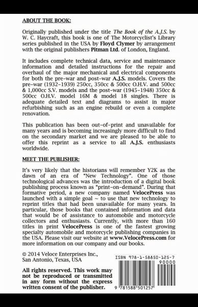160 pages, 79 black & white illustrations, size 5.5 x 8.5 inches. Originally published under the title The Book of the A.J.S. by W. C. Haycraft, this book is one of The Motorcyclist's Library series published in the USA by Floyd Clymer by arrangement with the original publishers Pitman Ltd. of London, England. It includes complete technical data, service and maintenance information and detailed instructions for the repair and overhaul of the major mechanical and electrical components for both the pre-war and post-war A.J.S. models. Covers the pre-war (1932-1939) 250cc, 350cc & 500cc O.H.V. and 500cc & 1,000cc S.V. models and the post-war (1945-1948) 350cc & 500cc O.H.V. model 16M & model 18 singles. There is adequate detailed text and diagrams to assist in major refurbishing such as an engine rebuild or even a complete renovation. This publication has been out-of-print and unavailable for many years and is becoming increasingly more difficult to find on the secondary market. We are pleased to be able to offer this reproduction as a service to all A.J.S. enthusiasts worldwide.