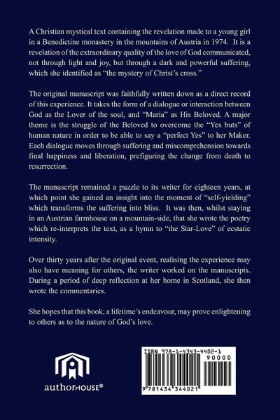 A Christian mystical text containing the revelation made to a young girl in a Benedictine monastery in the mountains of Austria in 1974. It is a revelation of the extraordinary quality of the love of God communicated, not through light and joy, but through a dark and powerful suffering, which she identified as "the mystery of Christ's cross." The original manuscript was faithfully written down as a direct record of this experience. It takes the form of a dialogue or interaction between God as the Lover of the soul, and "Maria" as His Beloved. A major theme is the struggle of the Beloved to overcome the "Yes buts" of human nature in order to be able to say a "perfect Yes" to her Maker. Each dialogue moves through suffering and miscomprehension towards final happiness and liberation, prefiguring the change from death to resurrection. The manuscript remained a puzzle to its writer for eighteen years, at which point she gained an insight into the moment of "self-yielding" which transforms the suffering into bliss. It was then, whilst staying in an Austrian farmhouse on a mountain-side, that she wrote the poetry which re-interprets the text, as a hymn to "the Star-Love" of ecstatic intensity. Over thirty years after the original event, realising the experience may also have meaning for others, the writer worked on the manuscripts. During a period of deep reflection at her home in Scotland, she then wrote the commentaries. She hopes that this book, a lifetime's endeavour, may prove enlightening to others as to the nature of God's love.
