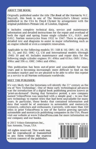 136 pages, 70 black & white illustrations, size 5.5 x 8.5 inches. Originally published under the title, 'The Book of the Norton' by W.C. Haycraft. This book is one of The Motorcyclist's Library series published in the USA by Floyd Clymer by arrangement with the original publisher, Pitman Ltd. of London, England. It includes complete technical data, service and maintenance information and detailed instructions for the repair and overhaul of both the rigid and spring frame single cylinder SV, OHV and OHC Norton motorcycles from 1932 to 1947. There is adequate detailed text and diagrams to assist in major refurbishing such as an engine rebuild or even a complete renovation. Applicable to the following models: SV: 16H & 16I. OHV: 18, 19, 20, 50, 55, and ES2. OHC: CJ, CSI and International models (through 1946) 30 and 40. Includes maintenance and repair data for the following single cylinder engines: SV: 490cc and 633cc. OHV: 350cc, 490cc and 596 cc. OHC: 348cc and 490cc. This publication has been out-of-print and unavailable for many years and is becoming increasingly more difficult to find on the secondary market. We are pleased to be able to offer this reproduction as a service to all Norton enthusiasts worldwide.