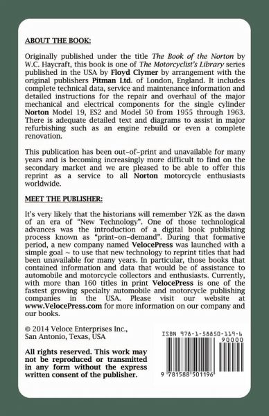 122 pages, 65 black & white illustrations, size 5.5 x 8.5 inches. Originally published under the title The Book of the Norton by W.C. Haycraft, this book is one of The Motorcyclist's Library series published in the USA by Floyd Clymer by arrangement with the original publishers Pitman Ltd. of London, England. It includes complete technical data, service and maintenance information and detailed instructions for the repair and overhaul of the major mechanical and electrical components for the O.H.V. single cylinder Model 19, ES2 and Model 50 from 1955 through 1963. There is adequate detailed text and diagrams to assist in major refurbishing such as an engine rebuild or even a complete renovation. This publication has been out-of-print and unavailable for many years and is becoming increasingly more difficult to find on the secondary market and we are pleased to be able to offer this reproduction as a service to all Norton motorcycle enthusiasts worldwide.