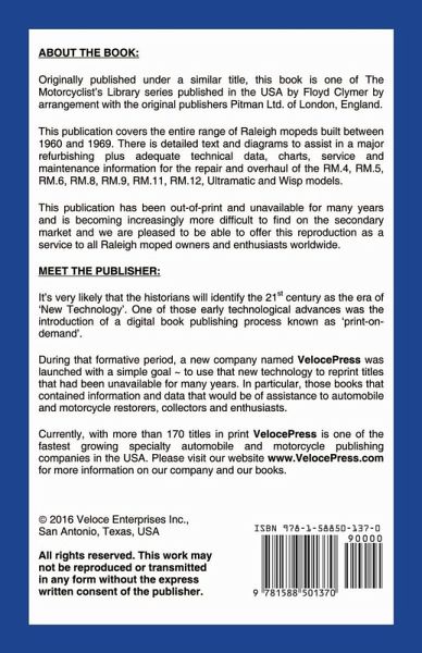92 pages, 46 black & white illustrations, size 5.5 x 8.5 inches. Originally published under a similar title, this book is one of The Motorcyclist's Library series published in the USA by Floyd Clymer by arrangement with the original publishers, Pitman Ltd. of London, England. This publication covers the entire range of Raleigh mopeds built between 1960 and 1969. There is detailed text and diagrams to assist in a major refurbishing plus adequate technical data, charts, service and maintenance information for the repair and overhaul of the RM.4, RM.5, RM.6, RM.8, RM.9, RM.11, RM.12, Ultramatic and Wisp models. This publication has been out-of-print and unavailable for many years and is becoming increasingly more difficult to find on the secondary market. We are pleased to be able to offer this reproduction as a service to all Raleigh moped owners and enthusiasts worldwide.