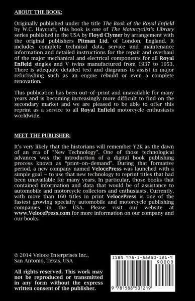 168 pages, 86 black & white illustrations, size 5.5 x 8.5 inches. Originally published under the title The Book of the Royal Enfield by W.C. Haycraft, this book is one of The Motorcyclist's Library series published in the USA by Floyd Clymer by arrangement with the original publishers Pitman Ltd. of London, England. It includes complete technical data, service and maintenance information and detailed instructions for the repair and overhaul of the major mechanical and electrical components for all Royal Enfield singles and V twins manufactured from 1937 through 1953. There is adequate detailed text and diagrams to assist in major refurbishing such as an engine rebuild or even a complete renovation. This publication has been out-of-print and unavailable for many years and is becoming increasingly more difficult to find on the secondary market and we are pleased to be able to offer this reproduction as a service to all Royal Enfield motorcycle enthusiasts worldwide.