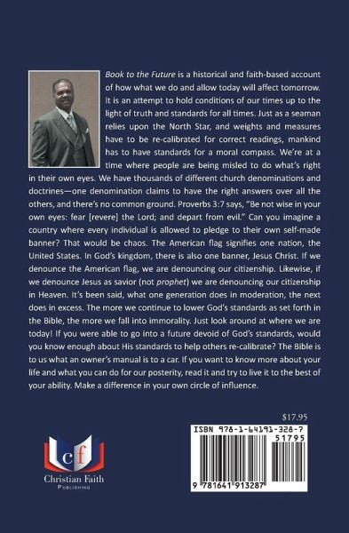 Book to the Future is a historical and faith-based account of how what we do and allow today will affect tomorrow. It is an attempt to hold conditions of our times up to the light of truth and standards for all times. Just as a seaman relies upon the North Star, and weights and measures have to be re-calibrated for correct readings, mankind has to have standards for a moral compass. We're at a time where people are being misled to do what's right in their own eyes. We have thousands of different church denominations and doctrines - one denomination claims to have the right answers over all the others, and there's no common ground. Proverbs 3:7 says, "Be not wise in your own eyes: fear [revere] the Lord; and depart from evil." Can you imagine a country where every individual is allowed to pledge to their own self-made banner? That would be chaos. The American flag signifies one nation, the United States. In God's kingdom, there is also one banner, Jesus Christ. If we denounce the American flag, we are denouncing our citizenship. Likewise, if we denounce savior Jesus (not prophet) we are denouncing our citizenship in Heaven. It's been said, what one generation does in moderation, the next does in excess. The more we continue to lower God's standards as set forth in the Bible, the more we fall into immorality. Just look around at where we are today! If you were able to go into a future devoid of God's standards, would you know enough about His standards to help others re-calibrate? The Bible is to us what an owner's manual is to a car. If you want to know more about your life and what you can do for our posterity, read it and try to live it to the best of your ability. Make a difference in your own circle of influence.
