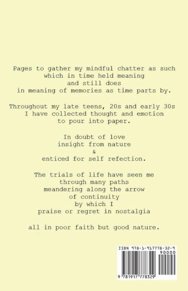Pages to gather my mindful chatter as such which in time held meaning and still doesin meaning of memories as time parts by. Throughout my late teens, 20s* and early 30sI have collected thought and emotionto pour into paper. In doubt of loveinsight from nature&enticed for self refection. The trials of life have seen methrough many pathsmeandering along the arrowof continuityby which Ipraise or regret in nostalgia all in poor faith but good nature. *foff, what a rollercoaster they were.