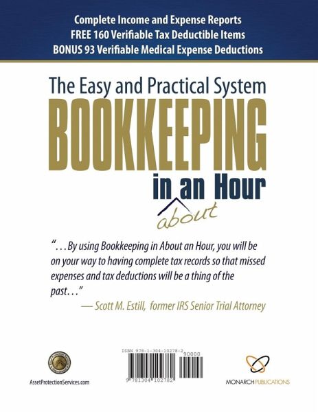Bookkeeping in About an Hour provides one "tried and true" method of gathering the applicable documents, receipts and other information to preserve, claim and be able to back up tax deductions and credits reported on your business tax return. Without these records, your accounting system will be set up to fail. By using Bookkeeping in About an Hour, you will be on your way to having complete tax records so that missed expenses and tax deductions will be a thing of the past!