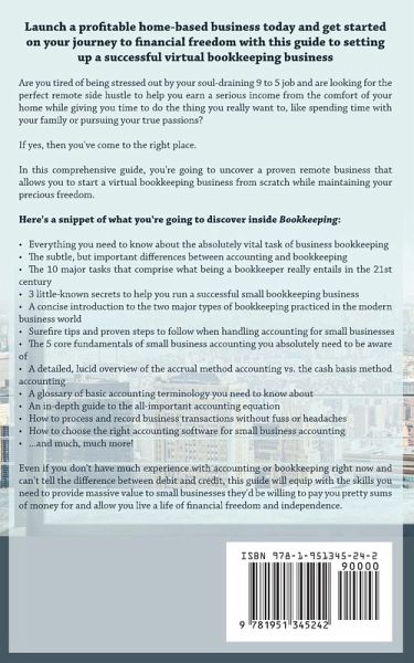 Launch a profitable home-based business today and get started on your journey to financial freedom with this guide to setting up a successful virtual bookkeeping business Are you tired of being stressed out by your soul-draining 9 to 5 job and are looking for the perfect remote side hustle to help you earn a serious income from the comfort of your home while giving you time to do the thing you really want to, like spending time with your family or pursuing your true passions? If yes, then you've come to the right place. In this comprehensive guide, you're going to uncover a proven remote business that allows you to start a virtual bookkeeping business from scratch while maintaining your precious freedom. Here's a snippet of what you're going to discover inside Bookkeeping: * Everything you need to know about the absolutely vital task of business bookkeeping * The subtle, but important differences between accounting and bookkeeping * The 10 major tasks that comprise what being a bookkeeper really entails in the 21st century * 3 little-known secrets to help you run a successful small bookkeeping business * A concise introduction to the two major types of bookkeeping practiced in the modern business world * Surefire tips and proven steps to follow when handling accounting for small businesses * The 5 core fundamentals of small business accounting you absolutely need to be aware of * A detailed, lucid overview of the accrual method accounting vs. the cash basis method accounting * A glossary of basic accounting terminology you need to know about * An in-depth guide to the all-important accounting equation * How to process and record business transactions without fuss or headaches * How to choose the right accounting software for small business accounting * ...and much, much more! Even if you don't have much experience with accounting or bookkeeping right now and can't tell the difference between debit and credit, this guide will equip with the skills you need to provide massive value to small businesses they'd be willing to pay you pretty sums of money for and allow you live a life of financial freedom and independence. Scroll to the top of the page and click the "Buy Now" button to get started today!
