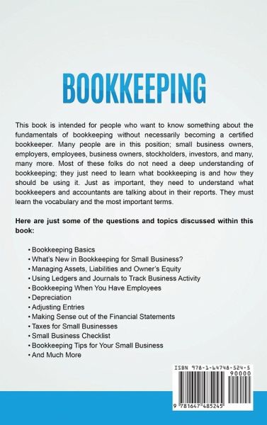 Say goodbye to scratching your head in confusion This bookkeeping book could be the answer you're looking for... This book is intended for people who want to know something about the fundamentals of bookkeeping without necessarily becoming a certified bookkeeper. Many people are in this position; small business owners, employers, employees, business owners, stockholders, investors, and many, many more. Most of these folks do not need a deep understanding of bookkeeping; they just need to learn what bookkeeping is and how they should be using it. Just as important, they need to understand what bookkeepers and accountants are talking about in their reports. They must learn the vocabulary and the most important terms. If you are one of those, you have found the right book for you. As an added bonus, the book contains a section for business taxes. Included is also a step-by-step guide to preparing W-2 forms and the information needed for those. Here are just some of the questions and topics discussed within this book: Bookkeeping Basics What’s New in Bookkeeping for Small Business? Managing Assets, Liabilities and Owner’s Equity Using Ledgers and Journals to Track Business Activity Bookkeeping When You Have Employees Depreciation Adjusting Entries Making Sense out of the Financial Statements Taxes for Small Businesses Small Business Checklist Bookkeeping Tips for Your Small Business And Much, Much More Get the book now and start to learn about bookkeeping for small business
