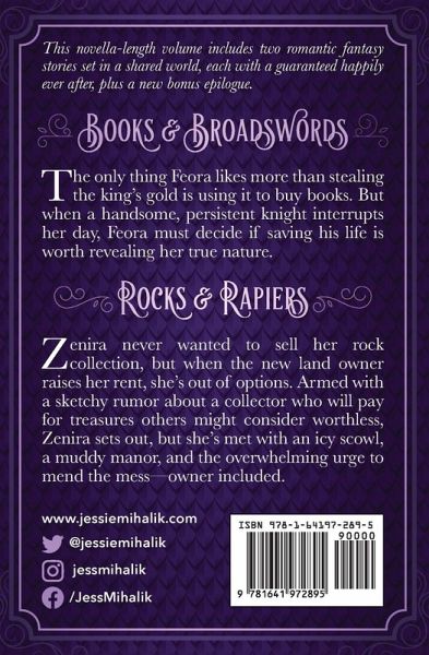 This novella-length volume includes two romantic fantasy stories set in a shared world, each with a guaranteed happily ever after, plus a new bonus epilogue. Books & Broadswords The only thing Feora likes more than stealing the king's gold is using it to buy books. But when a handsome, persistent knight interrupts her day, Feora must decide if saving his life is worth revealing her true nature. Rocks & Rapiers Zenira never wanted to sell her rock collection, but when the new landowner raises her rent, she's out of options. Armed with a sketchy rumor about a collector who will pay for stones others might consider worthless, Zenira sets out, but she's met with an icy scowl, a muddy manor, and the overwhelming urge to mend the mess-owner included.
