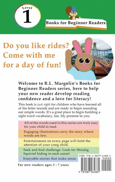 "Do you like rides? Come with me for a day of fun!"Brand new readers join a rabbit as she visits an amusement park.The words in this book are super easy to read for kids just learning to decode. Your child will want to jump right in to the exciting scenes on every page. A perfect choice as a first book for children who need to gain confidence reading independently and who are building a sight word vocabulary. About the series: Welcome to R.L. Margolin's Books for Beginner Readers series, here to help your new reader develop reading confidence and a love for literacy! This book is just right for children who have learned all of the letter sounds and are ready to begin sounding out simple words. It's a great place to begin building a sight word vocabulary, too. My promises to you: All the words used in the series are truly easy for your child to read. The stories make sense. Engaging illustrations help carry the story where words are few. Entertainment on every page will hold the attention of your young child. Seek and find challenge: Find Shindig Squirrel hiding in each scene! Recommended for new readers ages 3-7.