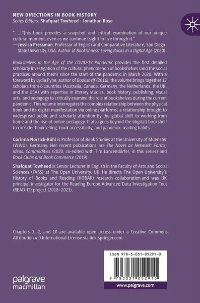 Bookshelves in the Age of the COVID-19 Pandemic provides the first detailed scholarly investigation of the cultural phenomenon of bookshelves (and the social practices around them) since the start of the pandemic in March 2020. With a foreword by Lydia Pyne, author of Bookshelf (2016), the volume brings together 17 scholars from 6 countries (Australia, Canada, Germany, the Netherlands, the UK, and the USA) with expertise in literary studies, book history, publishing, visual arts, and pedagogy to critically examine the role of bookshelves during the current pandemic. This volume interrogates the complex relationship between the physical book and its digital manifestation via online platforms, a relationship brought to widespread public and scholarly attention by the global shift to working from home and the rise of online pedagogy. It also goes beyond the (digital) bookshelf to consider bookselling, book accessibility, and pandemic reading habits.