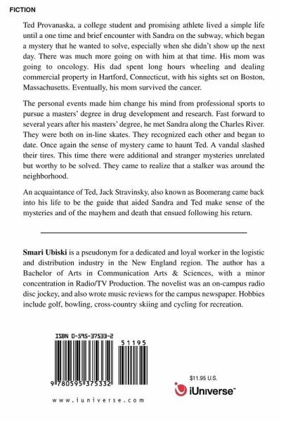 Ted Provanaska, a college student and promising athlete lived a simple life until a one time and brief encounter with Sandra on the subway, which began a mystery that he wanted to solve especially when she didn't show up the next day. There was much more going on with him at that time. His mom was going to oncology. His dad spent long hours wheeling and dealing commercial property in Hartford, Connecticut, with his sights set on Boston, Massachusetts. Eventually, his mom survived the cancer. The personal events made him change his mind from professional sports to pursue a masters' degree in drug development and research. Fast forward to several years after his masters' degree, he met Sandra along the Charles River. They were both on in-line skates. They recognized each other and began to date. Once again the sense of mystery came to haunt Ted. A vandal slashed their tires. This time there were additional and stranger mysteries unrelated but worthy to be solved. They came to realize that a stalker was around the neighborhood. An acquaintance of Ted, Jack Stravinsky also known as Boomerang came back into his life to be the guide that aided Sandra and Ted make sense of the mysteries and of the mayhem and death that ensued following his return.