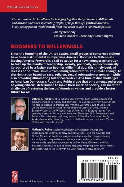 Since the founding of the United States, small groups of concerned citizens have been instrumental in improving America. "Boomers to Millennials: Moving America Forward" is a call-to-action for a new, younger generation to take up the mantle of leadership, socially, politically, and economically. Co-authored by a father-son Boomer-Millennial duo, this timely book addresses hot-button issues – from immigration reform, to climate change, to discrimination based on race, religion, sexual orientation or gender – while also providing illuminating historical context. At a time of dire challenges to American Democracy, Rubin and Rubin argue that only an engaged group of young citizens, determined to make their mark on society, can meet the challenge of restoring the best of American values and provide a better future for all.