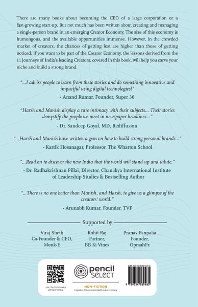 There are many books about becoming the CEO of a large corporation or a fast-growing start-up. But not much has been written about creating and managing a single-person brand in an emerging Creator Economy. The size of this economy is humongous, and the available opportunities immense. However, in the crowded market of creators, the chances of getting lost are higher than those of getting noticed. If you want to be part of the Creator Economy, the lessons derived from the 11 journeys of India's leading Creators, covered in this book, will help you carve your niche and build a strong brand. Creators Covered Bhuvan Bam, Ashish Chanchlani, Kabita Singh, Nikunj Lotia,Prajakta Koli, Ranveer Allahbadia, Madan Gowri, Team Naach, Yashraj Mukhate, Abhi and Niyu, Ujjwal Chaurasia
