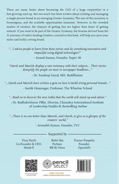 There are many books about becoming the CEO of a large corporation or a fast-growing start-up. But not much has been written about creating and managing a single-person brand in an emerging Creator Economy. The size of this economy is humongous, and the available opportunities immense. However, in the crowded market of creators, the chances of getting lost are higher than those of getting noticed. If you want to be part of the Creator Economy, the lessons derived from the 11 journeys of India's leading Creators, covered in this book, will help you carve your niche and build a strong brand. Creators Covered Bhuvan Bam, Ashish Chanchlani, Kabita Singh, Nikunj Lotia,Prajakta Koli, Ranveer Allahbadia, Madan Gowri, Team Naach, Yashraj Mukhate, Abhi and Niyu, Ujjwal Chaurasia