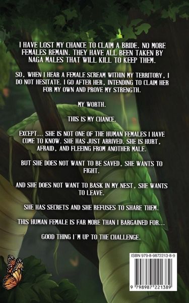 I have lost my chance to claim a bride. No more females remain. They have all been taken by naga males that will kill to keep them. So, when I hear a female scream within my territory, I do not hesitate. I go after her, intending to claim her for my own and prove my strength. My worth. This is my chance. Except... she is not one of the human females I have come to know. She has just arrived. She is hurt, afraid, and fleeing from another male. But she does not want to be saved, she wants to fight. And she does not want to bask in my nest, she wants to leave. She has secrets and she refuses to share them. This human female is far more than I bargained for... Good thing I'm up to the challenge.