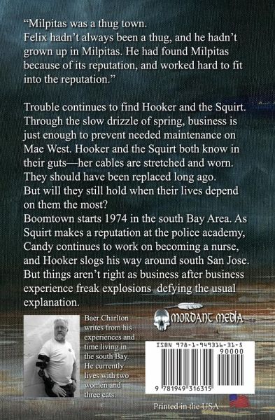 "Milpitas was a thug's town. Felix hadn't always been a thug, and he hadn't grown up in Milpitas. He had found Milpitas because of its reputation, and he works hard to fit into the reputation." Boomtown starts in 1974 in the South Bay Area. As the Squirt makes his way and reputation at the police academy, and Candy continues to work on becoming a nurse, Hooker slogs his way around south San Jose. But things aren't right as business after business experiences freak explosions that defy explanation. Trouble continues to find Hooker and the Squirt. Through the slow drizzle of spring, business is just enough to prevent much-needed maintenance on Mae West. Hooker and the Squirt both know in their guts-her cables stretched and worn, should have been replaced long ago. They only hope the cables still hold when their lives depend on them the most.
