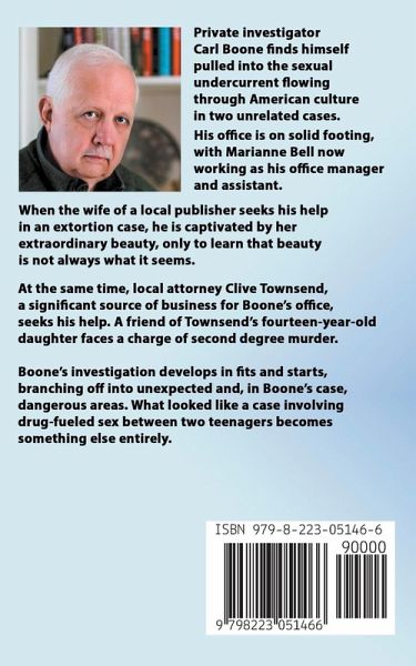 Private investigator Carl Boone finds himself pulled into the sexual undercurrent flowing through American culture in two unrelated cases. His office is on solid footing, with Marianne Bell now working as his office manager and assistant. When the wife of a local publisher seeks his help in an extortion case, he is captivated by her extraordinary beauty, only to learn that beauty is not always what it seems. At the same time, local attorney Clive Townsend, a significant source of business for Boone's office, seeks his help. A friend of Townsend's fourteen-year-old daughter faces a charge of second degree murder. His investigation develops in fits and starts, branching off into unexpected and, in Boone's case, dangerous areas. What looked like a case involving drug-fueled sex between two teenagers becomes something else entirely.