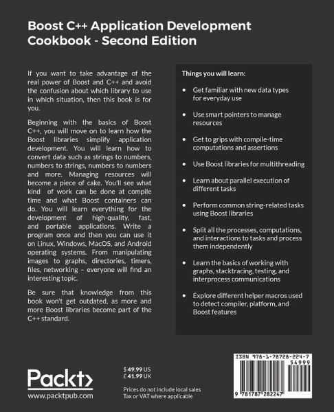 About This BookLearn to use the Boost libraries to simplify your application development Learn to develop high quality, fast and portable applications Learn the relations between Boost and C++11/C++4/C++17 Who This Book Is For This book is for developers looking to improve their knowledge of Boost and who would like to simplify their application development processes. Prior C++ knowledge and basic knowledge of the standard library is assumed.What You Will LearnGet familiar with new data types for everyday use Use smart pointers to manage resources Get to grips with compile-time computations and assertions Use Boost libraries for multithreading Learn about parallel execution of different tasks Perform common string-related tasks using Boost libraries Split all the processes, computations, and interactions to tasks and process them independently Learn the basics of working with graphs, stacktracing, testing, and interprocess communications Explore different helper macros used to detect compiler, platform, and Boost features In detail If you want to take advantage of the real power of Boost and C++ and avoid the confusion about which library to use in which situation, then this book is for you. Beginning with the basics of Boost C++, you will move on to learn how the Boost libraries simplify application development. You will learn how to convert data such as strings to numbers, numbers to strings, numbers to numbers and more. Managing resources will become a piece of cake. You'll see what kind of work can be done at compile time and what Boost containers can do. You will learn everything for the development of high-quality, fast, and portable applications. Write a program once and then you can use it on Linux, Windows, MacOS, and Android operating systems. From manipulating images to graphs, directories, timers, files, networking - everyone will find an interesting topic. Be sure that knowledge from this book won't get outdated, as more and more Boost libraries become part of the C++ Standard.