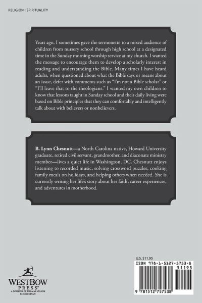 Years ago, I sometimes gave the sermonette to a mixed audience of children from nursery school through high school at a designated time in the Sunday morning worship service at my church. I wanted the message to encourage them to develop a scholarly interest in reading and understanding the Bible. Many times I have heard adults, when questioned about what the Bible says or means about an issue, defer with comments such as "I'm not a Bible scholar" or "I'll leave that to the theologians." I wanted my own children to know that lessons taught in Sunday school and their daily living were based on Bible principles that they can comfortably and intelligently talk about with believers or nonbelievers.