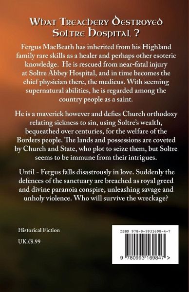Fergus MacBeath has inherited from his Highland family rare skills as a healer and perhaps other esoteric knowledge. He is rescued from near-fatal injury at Soltre Abbey Hospital, and in time becomes the chief physician there, the medicus. With seeming supernatural abilities, he is regarded among the country people as a saint. He is a maverick however and defies Church orthodoxy relating sickness to sin, using Soltre's wealth, bequeathed over centuries, for the welfare of the Borders people. The lands and possessions are coveted by Church and State, who plot to seize them, but Soltre seems to be immune from their intrigues. Until - Fergus falls disastrously in love. Suddenly the defences of the sanctuary are breached as royal greed and divine paranoia conspire, unleashing savage and unholy violence. Who will survive the wreckage?