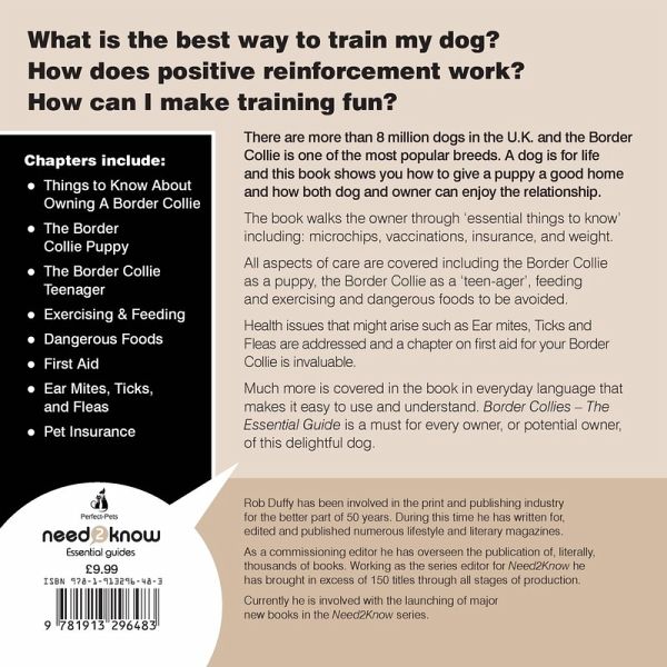 Border Collies are one of the most popular breeds in Britain. A dog is for life and this book shows how to give a puppy a good home and how both dog and owner can enjoy the relationship. 'Border Collies' walks the owner through the essentials, including: microchips; vaccinations; insurance; weight etc. All aspects of care are covered including: the Border Collie as a puppy; the Border Collie as a 'teen-ager'; feeding; exercising and dangerous foods to be avoided. Health issues that might arise such as ear mites, ticks and fleas are addressed. A chapter on first aid for Border Collies is invaluable. Much more is covered using everyday language that makes it easy to use and understand. Border Collies - The Essential Guide is a must for every owner, or potential owner, of this delightful dog