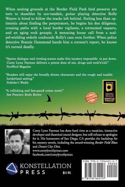 The second novel in the Rolly Waters mystery series. When nesting grounds at the Border Field Park bird preserve are torn to shambles by eco-vandals, Rolly Waters is hired to follow the tracks left behind. Feeling less than optimistic about nabbing the perpetrators, he begins his due diligence, crossing paths with a local border vigilante, a tormented vaquero, and an aging rock groupie. A menacing house call from a scalpel-wielding orderly in pursuit of a prostitute named after an 80's pop hit confounds Rolly's case even further. When police detective Bonnie Hammond hands him a coroner's report, he knows it's turned deadly. This rollicking Southern California crime novel merges old-school detective story-telling with contemporary issues of immigration, political extremism, and the idiosyncrasies of playing the blues. A cozy hero living in a noir world, Rolly Waters struggles with his identity as a former musician as he attempts to recover from his rock and roll past. A colorful cast of local characters fleshes out this engaging mystery, which takes Rolly and the reader on a fast-paced ride through a dangerous underworld of record company intrigues, video games, international sex trafficking, and murder.