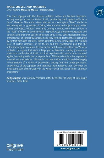 This book engages with the diverse traditions within non-Western Marxisms, as they emerge across the Global South, positioning itself against calls for a "pure" Marxism. The author views Marxism as a conceptual "field," similar to electromagnetic or gravitational fields, where bodies and objects impact other bodies and objects without necessarily coming in contact with them. So too, in the "field" of Marxism, people behave in specific ways and deploy languages and concepts with their own specific inflections and accents. While rejecting the view of Marxism as an inherently European and fully-formed doctrine that is corrupted by contact with alien contexts, Nigam simultaneously acknowledges the residual force of certain elements of the theory and the gravitational pull that the authoritative figures continue to have on the evolution of the field in non-Western contexts. He argues that since a large part of Marxism's earthly journey was undertaken in the Global South, it is that experience that needs to be rendered legible, by setting aside the conceptual lens of Western Marxism that repeatedly misreads such experience. Ultimately, the book invites a fruitful and challenging re-examination of a variety of phenomena arising from the contemporaneous co-existence of pre-capitalist and capitalist social relations that have been an inextricable part of the majority of the world-what the author terms "untimely encounters."