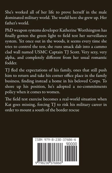 She's worked all of her life to prove herself in the male dominated military world. The world here she grew up. Her father's world. PhD weapon systems developer Katherine Worthington has finally gotten the green light to field test her surveillance system. Yet once out in the woods, it seems every time she tries to control the test, she runs smack dab into a cammo clad wall named USMC Captain TJ Scott. Very sexy, very alpha, and completely different from her usual romantic fodder. TJ fled the expectations of his family, ones that still push him to return and take his corner office place in the family business, finding instead a home in his beloved Corps. To shore up his position, he's adopted a no-commitments policy when it comes to women. The field test exercise becomes a real-world situation when Kat goes missing, forcing TJ to risk his military career in order to mount a south of the border rescue