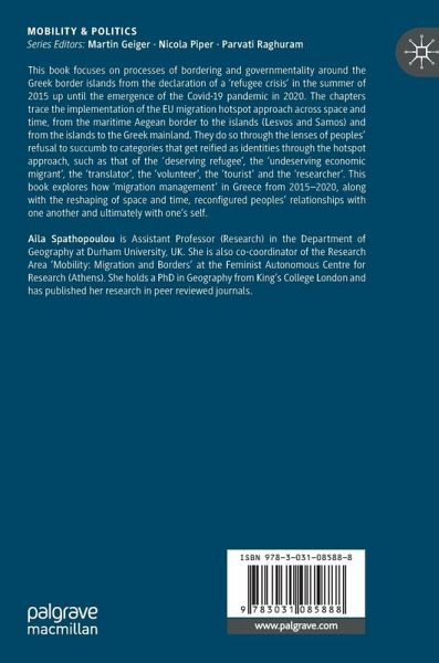 This book focuses on processes of bordering and governmentality around the Greek border islands from the declaration of a 'refugee crisis' in the summer of 2015 up until the emergence of the Covid-19 pandemic in 2020. The chapters trace the implementation of the EU migration hotspot approach across space and time, from the maritime Aegean border to the islands (Lesvos and Samos) and from the islands to the Greek mainland. They do so through the lenses of peoples' refusal to succumb to categories that get reified as identities through the hotspot approach, such as that of the 'deserving refugee', the 'undeserving economic migrant', the 'translator', the 'volunteer', the 'tourist' and the 'researcher'. This book explores how 'migration management' in Greece from 2015-2020, along with the reshaping of space and time, reconfigured peoples' relationships with one another and ultimately with one's self.
