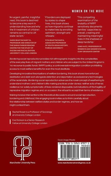 An urgent, painful, insightful read, this book is destined to become a key work in understanding how and why the ill-treatment of children remains so central to UK state racism. > If borders are deployed by states to shape lives, this book shows us how migrants continue to make lives by enrolling optimism, strength and refusals. > This compelling examination of the brutality of NRPF sensitively documents families' capacities to prevail, creating and maintaining meaningful lives in the shadows of deep hardship. > Bordering social reproduction provides rich ethnographic insights into the complexities of the everyday lives of migrant mothers and children who are subject to the United Kingdom's 'no recourse to public funds' (NRPF) policy, a controversial immigration condition prohibiting access to most welfare benefits for even the most destitute. Developing innovative theorisations of welfare bordering, this book shows how enforced destitution and debt work alongside detention and deportation as exclusionary technologies of the racial state. Bordering social reproduction advances the novel concept of weathering to understand mothers' and children's life-making practices under duress: neither acts of heroic resilience nor solely symptomatic of lives rendered disposable, but indications of the fragility of repressive migration regimes and, on occasion, the refusal to accept their terms of existence. Making incisive interventions into theoretical discussions around social reproduction, bordering and childhood, this engaging book invites us to think carefully about the relationship between welfare states and border regimes, and how we might contest them.