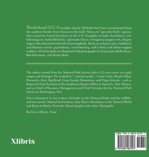 Borderland Birds includes almost 100 birds that I have encountered along the southern border from Arizona to the Gulf. Many are "specialty birds, species that cannot be found elsewhere in the U.S. Examples include chachalaca, red-billed pigeon, hook-billed kite, aplomado falcon, ferruginous pygmy-owl, elegant trogon, blue-throated and lucifer hummingbirds, Mexican and green jays, Audubon's and Altamira orioles, pyrrhuloxia, varied bunting, and Colima and rufous-capped warblers. All of the birds are illustrated with photographs by Greg Lasley, Kelly Bryan, Bob Behrstock, and Martin Reid.
