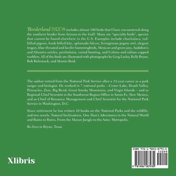 Borderland Birds includes almost 100 birds that I have encountered along the southern border from Arizona to the Gulf. Many are "specialty birds, species that cannot be found elsewhere in the U.S. Examples include chachalaca, red-billed pigeon, hook-billed kite, aplomado falcon, ferruginous pygmy-owl, elegant trogon, blue-throated and lucifer hummingbirds, Mexican and green jays, Audubon's and Altamira orioles, pyrrhuloxia, varied bunting, and Colima and rufous-capped warblers. All of the birds are illustrated with photographs by Greg Lasley, Kelly Bryan, Bob Behrstock, and Martin Reid.