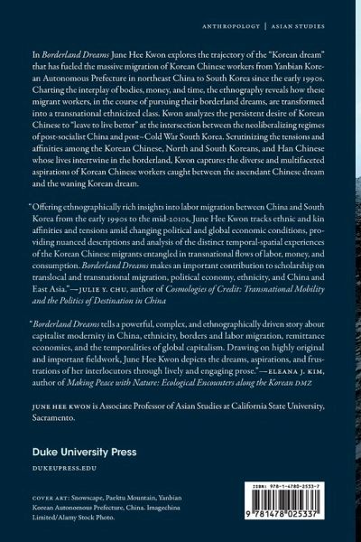 In Borderland Dreams June Hee Kwon explores the trajectory of the "Korean dream" that has fueled the massive migration of Korean Chinese workers from the Yanbian Korean Autonomous Prefecture in northeast China to South Korea since the early 1990s. Charting the interplay of bodies, money, and time, the ethnography reveals how these migrant workers, in the course of pursuing their borderland dreams, are transformed into a transnational ethnicized class. Kwon analyzes the persistent desire of Korean Chinese to "leave to live better" at the intersection between the neoliberalizing regimes of post-socialist China and post-Cold War South Korea. Scrutinizing the tensions and affinities among the Korean Chinese, North and South Koreans, and Han Chinese whose lives intertwine in the borderland, Kwon captures the diverse and multifaceted aspirations of Korean Chinese workers caught between the ascendant Chinese dream and the waning Korean dream.