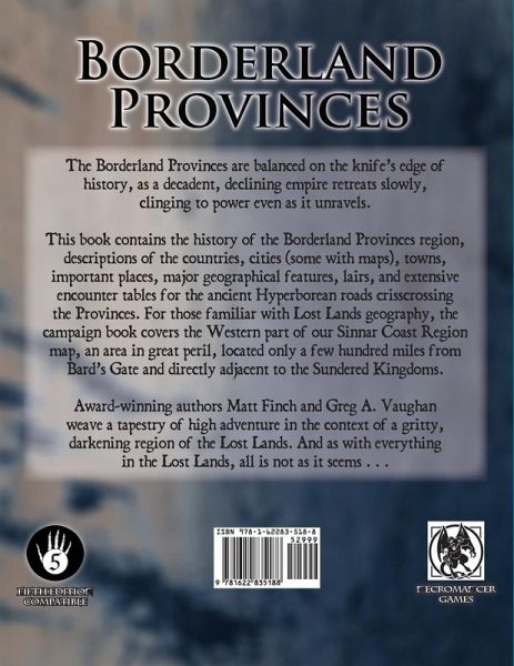 The Borderland Provinces are balanced on the knife's edge of history, as a decadent declining empire that retreats slowly, clinging to power, even as it unravels. This book contains the history of the Borderland Provinces region, descriptions of the countries, cities (some with maps), towns, important places, major geographical features, lairs, and extensive encounter tables for the ancient Hyperborean roads crisscrossing the Provinces. For those familiar with Lost Lands geography, the campaign book covers the Western part of our Sinnar Coast Region map, and area in great peril, located only a few hundred miles from Bard's Gate and directly adjacent to the Sundered Kingdoms. For 5th Edition.