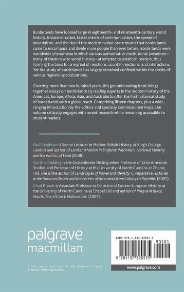 Introduction: Borderlands in a Global Perspective; Paul Readman, Cynthia Radding and Chad Bryant PART I: WRITING BORDERLANDS 1. Negotiating North America's New National Borders; Benjamin H. Johnson 2. 'The Men Who Made Australia Federated Long Ago': Australian Frontiers and Borderlands; Frank Bongiorno PART II: BORDERLANDS, TERRITORIALITY, AND LANDSCAPE 3. Environment, Territory, and Landscape Changes in Northern Mexico during the Era of Independence; Cynthia Radding 4. 'We are Comfortable Riding the Waves': Landscape and the Formation of a Border State in Eighteenth-Century Island Southeast Asia; Timothy P. Barnard 5. From Constituting Communities to Dividing Districts: The Formalization of a Cultural Border between Mombasa and its Hinterland; Daren Ray PART III: BORDERLANDS AND STATE ACTION 6. Not by Force Alone: Public Health and the Establishment of the Russian Rule in the Russo-Polish Borderland, 1762-85; Oksana Mykhed 7. Borders, War, and Nation-Building in Napoleon's Europe; Michael Rowe PART IV: NATIONAL IDENTITIES AND EUROPEAN BORDERLANDS 8. Living a British Borderland: Northumberland and the Scottish Borders in the Long Nineteenth Century; Paul Readman 9. Church Fights: Nationality, Class, and the Politics of Church Building in a German-Polish Borderland, 1890-1914; Jim Bjork PART V: BORDERLANDERS: LABOR AND SOCIAL EXPERIENCE 10. 'Frontier Indians': 'Indios Mansos', 'Indios Bravos', and the Layers of Indigenous Existence in the Caribbean Borderlands; Jason M. Yaremko 11. The Twisted Logic of the Ohio River Borderland; Matthew Salafia 12. Boundaries of Slavery in Mid Nineteenth-Century Liberia; Lisa A. Lindsay PART VI: READING BORDERS: INDIVIDUALS AND THEIR BORDERLANDS 13. Unofficial Frontiers: Welsh-English Borderlands in the Victorian Period; Roland Quinault 14. 'Home on the Range': Rootedness and Identity in the Borderlands of the Nineteenth-Century American West; Nina Vollenbröker Concluding Reflections: Borderlands Histories and the Categories ofHistorical Analysis; Lloyd Kramer