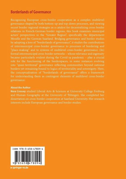 Recognizing European cross-border cooperation as a complex multilevel governance shaped by both bottom-up and top-down processes, and viewing recent border-regional strategies as a catalyst for decentralizing cross-border relations in French-German border regions, this book examines municipal actors perspectives in the Greater Region , specifically the département Moselle and the German Saarland. Bridging governance and border studies by adopting a lens of borderlands of governance , it studies the contributions of intermunicipal cross-border governance to processes of bordering and place-making and to systems of multilevel cross-border governance. (In)formal intermunicipal cross-border networks whose relevance and ingenuity became particularly evident during the Covid-19 pandemic play a crucial role for the functioning of the borderspaces, in some instances evolving into quasi-territorial governance reflecting communities beyond national borders yet remaining bound to logics of territoriality and sovereignty. Here, the conceptualisation of borderlands of governance offers a framework for understanding them as contingent elements of multilevel cross-border governance.