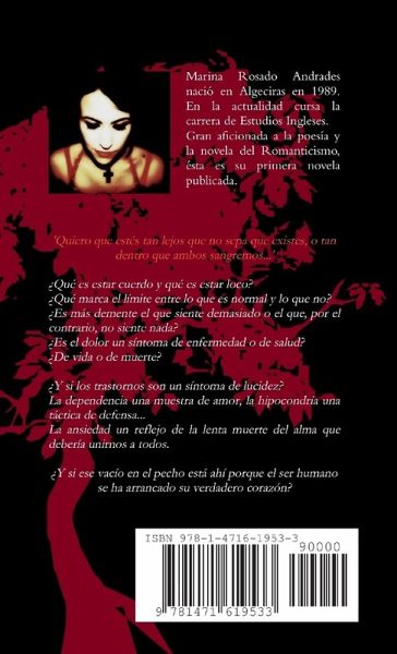 ¿Qué es estar cuerdo y qué es estar loco? ¿Qué marca el límite entre lo que es normal y lo que no? ¿Es más demente el que siente demasiado o el que, por el contrario, no siente nada? ¿Es el dolor un síntoma de enfermedad o de salud? ¿De vida o de muerte? Si es la crueldad la que indica la locura, entonces es el mundo el que tiene un problema. Yo no estoy loca, solo siento y percibo más que tú; emociones que no imaginas, realidades que no encuentras, tiempos que se te antojan inexistentes. ¿Y si los "trastornos" son síntomas de lucidez? La dependencia una muestra de amor, la hipocondría una táctica de defensa... La ansiedad el reflejo de la lenta muerte del alma que debería unirnos a todos. ¿Y si ese vacío en el pecho está ahí porque el ser humano se ha arrancado su verdadero corazón?