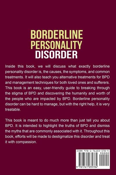BORDERLINE PERSONALITY DISORDER ¿Inside this book, we will discuss what exactly Borderline Personality Disorder is, the causes, the symptoms, and common treatments. This book will also teach you about alternative treatments for BPD, and management techniques for both loved ones and sufferers. This book is an easy, user-friendly guide to breaking through the stigma of BPD and discovering the humanity and worth of the people who are impacted by BPD. Borderline Personality Disorder can be hard to manage, but with the right help, it is very treatable. This book is meant to do much more than just tell you about BPD. It is intended to highlight the truths of BPD and dismiss the myths that are commonly associated with it. Throughout this book, efforts will be made to destigmatize this disorder and treat it with compassion. Here Is A Preview Of What You'll Learn About Inside... What Is Borderline Personality Disorder Signs And Symptoms Of BPD How BPD Is Diagnosed Common Treatment Methods For BPD Treating BPD With Therapy How To Help A Loved One With BPD Much, Much More!