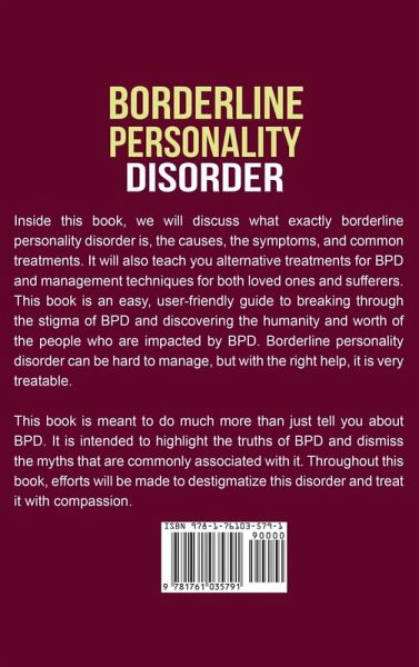 BORDERLINE PERSONALITY DISORDER ¿Inside this book, we will discuss what exactly Borderline Personality Disorder is, the causes, the symptoms, and common treatments. This book will also teach you about alternative treatments for BPD, and management techniques for both loved ones and sufferers. This book is an easy, user-friendly guide to breaking through the stigma of BPD and discovering the humanity and worth of the people who are impacted by BPD. Borderline Personality Disorder can be hard to manage, but with the right help, it is very treatable. This book is meant to do much more than just tell you about BPD. It is intended to highlight the truths of BPD and dismiss the myths that are commonly associated with it. Throughout this book, efforts will be made to destigmatize this disorder and treat it with compassion. Here Is A Preview Of What You'll Learn About Inside... What Is Borderline Personality Disorder Signs And Symptoms Of BPD How BPD Is Diagnosed Common Treatment Methods For BPD Treating BPD With Therapy How To Help A Loved One With BPD Much, Much More!