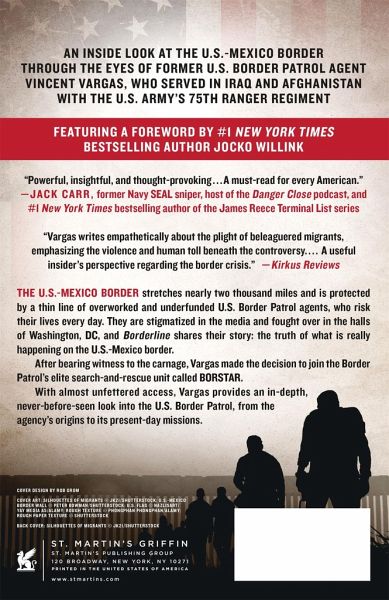 An inside look at the U.S.-Mexico border through the eyes of former U.S. Border Patrol agent, Vincent Vargas, who served in Iraq and Afghanistan with the U.S. Army's 75th Ranger Regiment. Featuring a Foreword by #1 New York Times bestselling author Jocko Willink. The U.S.-Mexico border stretches nearly two thousand miles and is protected by a thin line of overworked and underfunded U.S. Border Patrol Agents who risk their lives every day. They are stigmatized in the media and fought over in the halls of Washington D.C., and Borderline shares their story: the truth of what is really happening on the U.S.-Mexico border. The story begins on the battlefields of the Middle East and culminates on the southwest border of the United States, where Vargas was tasked with protecting his country, his fellow agents, and the immigrants caught in the middle. He learned firsthand about the unforgiving brutality of the cartels, human traffickers, and the desert. After bearing witness to the carnage, Vargas made the decision to join the Border Patrol's elite search-and-rescue unit called BORSTAR. With almost unfettered access, Vargas provides an in-depth, never-before-seen look into the U.S. Border Patrol, from the agency's origins to its present-day missions.