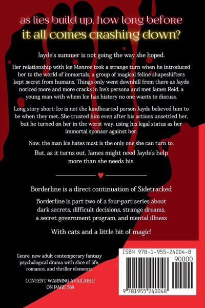Borderline is a direct continuation of Sidetracked. As such, this description includes major spoilers for the first book in the series. Please check out Sidetracked first before reading Borderline! --- Jayde Palmer's summer is not going the way she hoped. One month ago, Jayde's "casual summer relationship" with Ice Monroe took a strange turn when he introduced her to the world of immortals, a group of feline shapeshifters kept secret from humans. Things only went downhill as Jayde noticed more and more cracks in Ice's persona and later met James Reid, a young man with which Ice has some kind of history no one wants to talk about. Long story short: Ice is not the kindhearted person Jayde believed him to be when they first met. She trusted him even after his actions unsettled her, but he turned on her in the worst way, hurting her and using his legal status as her immortal sponsor against her. Now, Ice's worst enemy is the only one who can help her. But, as it turns out, James might need her help more than she needs his.