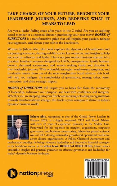 TAKE CHARGE OF YOUR FUTURE, REIGNITE YOUR LEADERSHIP JOURNEY, AND REDEFINE WHAT IT MEANS TO LEAD Are you a leader feeling stuck after years in the C-suite? Are you an aspiring board member or a seasoned director questioning your next move? BORED of DIRECTORS is a transformative guide that will reignite your passion, reshape your approach, and elevate your role in the boardroom. Written by Jishore Abic, this book explores the dynamics of boardrooms and corporate governance, sharing real-life stories, key moments, and insights to help you excel as a director and leader. This is not just another business manual; it's a practical, hands-on resource designed for CXOs, entrepreneurs, family business owners, chartered accountants, and anyone seeking clarity and direction in their leadership journey. With actionable strategies, ready-to-use templates, and invaluable lessons from one of the most sought-after board advisors, this book will help you navigate the complexities of governance, manage crises, foster innovation, and drive strategic impact. BORED of DIRECTORS will inspire you to break free from the monotony of leadership, rediscover your purpose, and lead with confidence and integrity. Whether you are stepping into your first board meeting or leading an organization through transformational change, this book is your compass to thrive in today's dynamic business world.