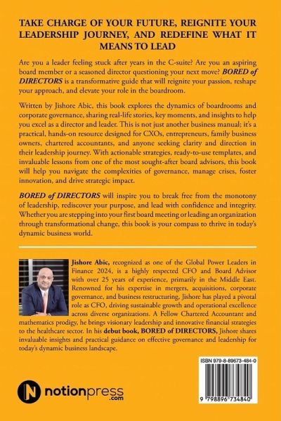 TAKE CHARGE OF YOUR FUTURE, REIGNITE YOUR LEADERSHIP JOURNEY, AND REDEFINE WHAT IT MEANS TO LEAD Are you a leader feeling stuck after years in the C-suite? Are you an aspiring board member or a seasoned director questioning your next move? BORED of DIRECTORS is a transformative guide that will reignite your passion, reshape your approach, and elevate your role in the boardroom. Written by Jishore Abic, this book explores the dynamics of boardrooms and corporate governance, sharing real-life stories, key moments, and insights to help you excel as a director and leader. This is not just another business manual; it's a practical, hands-on resource designed for CXOs, entrepreneurs, family business owners, chartered accountants, and anyone seeking clarity and direction in their leadership journey. With actionable strategies, ready-to-use templates, and invaluable lessons from one of the most sought-after board advisors, this book will help you navigate the complexities of governance, manage crises, foster innovation, and drive strategic impact. BORED of DIRECTORS will inspire you to break free from the monotony of leadership, rediscover your purpose, and lead with confidence and integrity. Whether you are stepping into your first board meeting or leading an organization through transformational change, this book is your compass to thrive in today's dynamic business world.