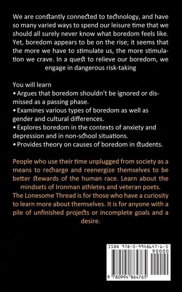 We are constantly connected to technology, and have so many varied ways to spend our leisure time that we should all surely never know what boredom feels like. Yet, boredom appears to be on the rise; it seems that the more we have to stimulate us, the more stimulation we crave. In a quest to relieve our boredom, we engage in dangerous risk-taking You will learnArgues that boredom shouldn't be ignored or dismissed as a passing phase. Examines various types of boredom as well as gender and cultural differences. Explores boredom in the contexts of anxiety and depression and in non-school situations. Provides theory on causes of boredom in students. People who use their time unplugged from society as a means to recharge and reenergize themselves to be better stewards of the human race. Learn about the mindsets of Ironman athletes and veteran poets. The Lonesome Thread is for those who have a curiosity to learn more about themselves. It is for anyone with a pile of unfinished projects or incomplete goals and a desire.
