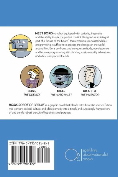 Meet Boris—a gentle robot equipped with curiosity, ingenuity, and the ability to mix the perfect martini. Designed as an integral part of a "house of the future" known as Zükünfthaus, this recreation specialist finds his programming insufficient when the future is different than expected. Boris distracts himself from anxieties through dancing, cocktails, costumes, pillow fights and road trips. BORIS: ROBOT OF LEISURE is a graphic novel that blends retro-futuristic science fiction, mid-century cocktail culture and silent comedy into a timely and surprisingly human story of one robot’s pursuit of happiness and fulfillment. Set in our post-atomic age, BORIS: ROBOT OF LEISURE reflects the reality of the early 21st century—society has abandoned space-age novelties like robot helpers and fully automated homes, leaving Boris and his Zükünfthaus as relics from an unrealized future. The world of The Jetsons never came to pass. But then, Boris has more fun than their maid Rosie ever did.