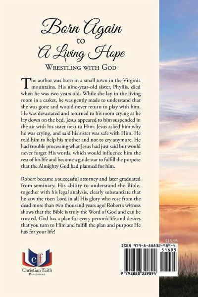 The author was born in a small town in the Virginia mountains. His nine-year-old sister, Phyllis, died when he was two years old. While she lay in the living room in a casket, he was gently made to understand that she was gone and would never return to play with him. He was devastated and returned to his room crying as he lay down on the bed. Jesus appeared to him suspended in the air with his sister next to Him. Jesus asked him why he was crying, and said his sister was safe with Him. He told him to help his mother and not to cry anymore. He had trouble processing what Jesus had just said but would never forget His words, which would influence him the rest of his life and become a guide star to fulfill the purpose that the Almighty God had planned for him. Robert became a successful attorney and later graduated from seminary. His ability to understand the Bible, together with his legal analysis, clearly substantiate that he saw the risen Lord in all His glory who rose from the dead more than two thousand years ago! Robert's witness shows that the Bible is truly the Word of God and can be trusted. God has a plan for every person's life and desires that you turn to Him and fulfill the plan and purpose He has for your life!