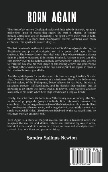 BORN AGAIN, an historical fantasy combining biographical/cultural fact with character-rich fiction. For history buffs, this presents the real world as it evolves from the thirteenth to the twentieth century; for fans of magical realism, this story teases the idea of a selfish, malevolent spirit traveling through time. The novel traces the successive reincarnations of a 13th century Scottish bastard son of an innocent girl and her lecherous bishop. The sins of Malcolm Murray's father are visited upon him in the form of physical deformity, making him shunned by his society. Malcolm, although ordained as a priest, becomes an unrepentant sexual predator devoted to the cult of Dionysus. He believes that after his death, he will, like Dionysus, live again. In fact, he "returns" as Diego De Herrera, an Augustinian friar in the 1870s doing missionary work in the Philippines where he becomes convinced that the only way to convert and save the natives is through stern and even cruel self-inflicted punishment. At his death, he expects the reward of heaven, but is instead reborn as Josef Goebbels in 1930s Germany. It is as Goebbels that, through arcane texts, he comes to consciously realize his rebirths, and he uses this knowledge to justify his own excesses. All three of the characters are historical figures living their experiences in historically accurate places and during true events of their times. For each of them, what they most desire dictates their actions and, ultimately, seals their fates. In addition, each of them bears a physical infirmity which symbolizes/represents their fatal flaw. BORN AGAIN is a tale of how excess, whether good or of bad, has consequences.