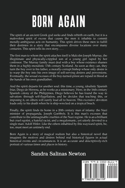 BORN AGAIN, an historical fantasy combining biographical/cultural fact with character-rich fiction. For history buffs, this presents the real world as it evolves from the thirteenth to the twentieth century; for fans of magical realism, this story teases the idea of a selfish, malevolent spirit traveling through time. The novel traces the successive reincarnations of a 13th century Scottish bastard son of an innocent girl and her lecherous bishop. The sins of Malcolm Murray's father are visited upon him in the form of physical deformity, making him shunned by his society. Malcolm, although ordained as a priest, becomes an unrepentant sexual predator devoted to the cult of Dionysus. He believes that after his death, he will, like Dionysus, live again. In fact, he "returns" as Diego De Herrera, an Augustinian friar in the 1870s doing missionary work in the Philippines where he becomes convinced that the only way to convert and save the natives is through stern and even cruel self-inflicted punishment. At his death, he expects the reward of heaven, but is instead reborn as Josef Goebbels in 1930s Germany. It is as Goebbels that, through arcane texts, he comes to consciously realize his rebirths, and he uses this knowledge to justify his own excesses. All three of the characters are historical figures living their experiences in historically accurate places and during true events of their times. For each of them, what they most desire dictates their actions and, ultimately, seals their fates. In addition, each of them bears a physical infirmity which symbolizes/represents their fatal flaw. BORN AGAIN is a tale of how excess, whether good or of bad, has consequences.