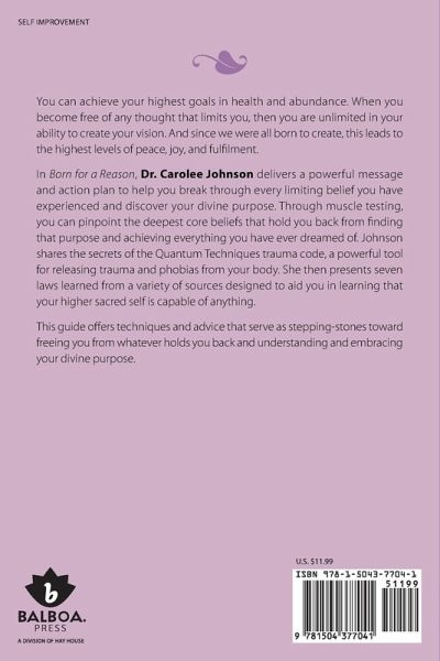 You can achieve your highest goals in health and abundance. When you become free of any thought that limits you, then you are unlimited in your ability to create your vision. And since we were all born to create, this leads to the highest levels of peace, joy, and fulfilment. In Born for a Reason, Dr. Carolee Johnson delivers a powerful message and action plan to help you break through every limiting belief you have experienced and discover your divine purpose. Through muscle testing, you can pinpoint the deepest core beliefs that hold you back from finding that purpose and achieving everything you have ever dreamed of. Johnson shares the secrets of the Quantum Techniques trauma code, a powerful tool for releasing trauma and phobias from your body. She then presents seven laws learned from a variety of sources designed to aid you in learning that your higher sacred self is capable of anything. This guide offers techniques and advice that serve as stepping-stones toward freeing you from whatever holds you back and understanding and embracing your divine purpose.
